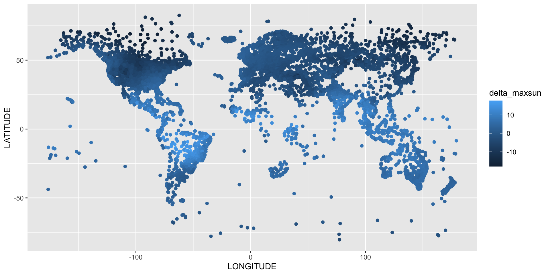 # sun declinationdeclination <-function(J2000T) asin(sin(epsilon(J2000T)) *sin(lambda(J2000T)))# irradiation in kWh per m^2 per dayinsolation <-function(J2000T, latitude) { rho <-rho(J2000T) h0 <-h0(J2000T, latitude) x <-sin(epsilon(J2000T)) *sin(lambda(J2000T))10.4033856721* rho*rho * (h0*sin(latitude)*x +cos(latitude)*cos(asin(x))*sin(h0))}